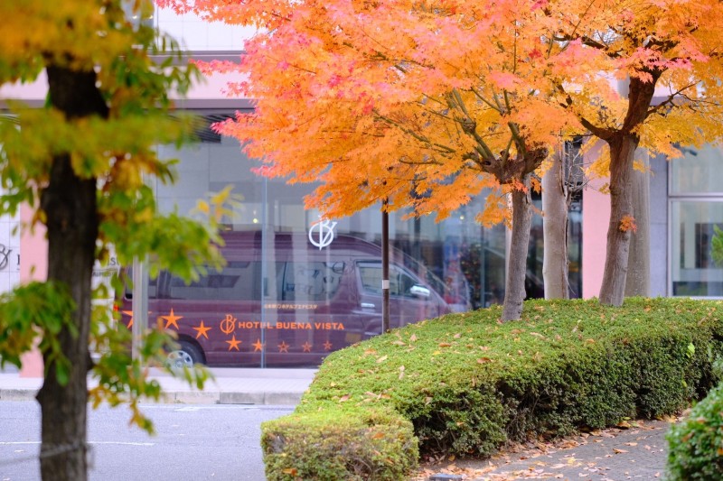 真っ赤に染まった木々の向こうにホテルブエナビスタの外観がのぞき、