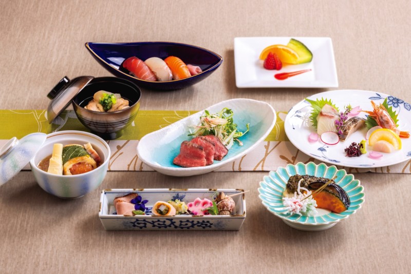 | 日本料理 | ・鯛の姿造りと季節のお造り盛合せ ・若鶏のもろみ味噌焼き ・天麩羅盛合せ など7品 |