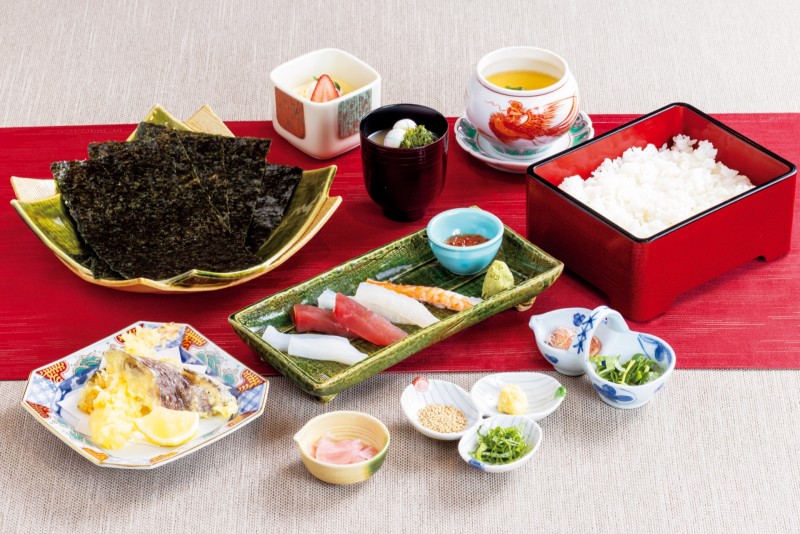 | 手巻き寿司 | (ハーブ) 大葉 茗荷 生姜 三つ葉 胡麻 山葵 (魚) 鮪 鯛 烏賊 海老 いくら がり 味噌汁 |