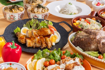 | Hot menu | 宮崎&信州産野菜のラタトゥイユ 春キャベツとベーコンのペペロンチーノ シラスと筑摩揚げのたけのこご飯 アサリと彩野菜のガーリックソテー 肉巻きおにぎり チキン南蛮 鶏肉の親子煮 ローストポーク BBQソース 白身魚のハーブマヨネーズ焼き 春巻&揚げ焼売 グリーンカレー 信州名物山賊焼き&から揚げ フライドポテト 宮崎辛麺 宮崎辛麺用麺 ガーリックカレー 春野菜のブイヨンスープ 県産釜炊きコシヒカリ |